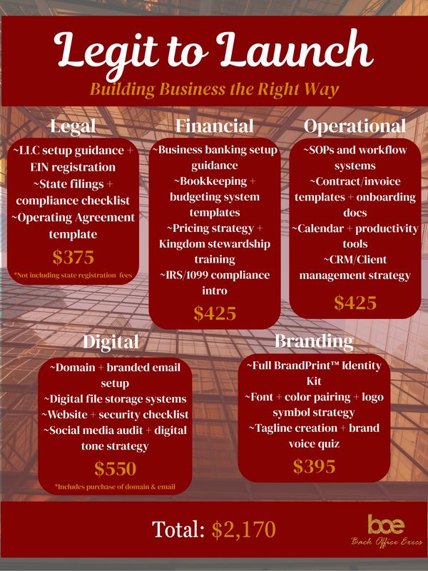 Legit to Launch™ is your essential blueprint for building a business that’s spiritually aligned, structurally sound, and publicly credible. Whether you’re an emerging entrepreneur or a visionary stuck in start-up mode, this program equips you with the foundational steps to legally, financially, and strategically establish your business for long-term success.